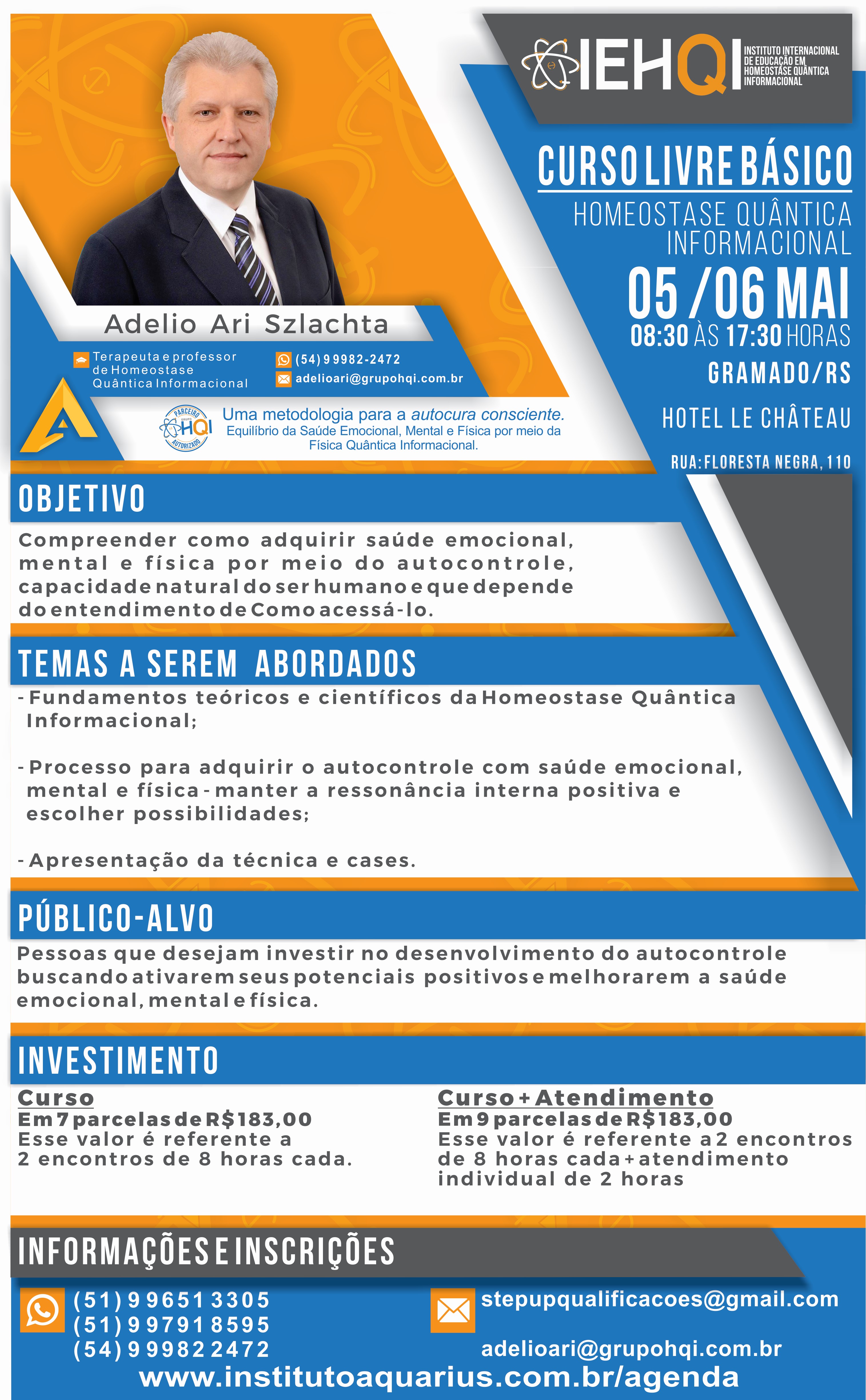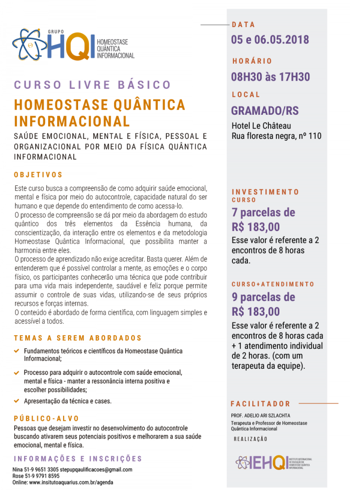 Gramado/RS - Curso Livre Básico de Homeostase Quântica Informacional - Dias 05 e 06/05/18 - Prof. Adelio Ari Szlachta