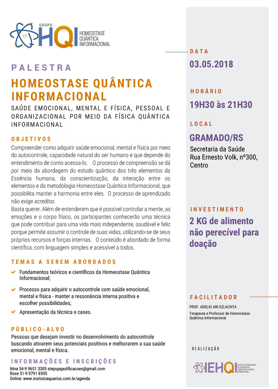 Gramado/RS - Palestra de Homeostase Quântica Informacional - Dia 03/05/18 - Prof. Adelio Ari Szlachta