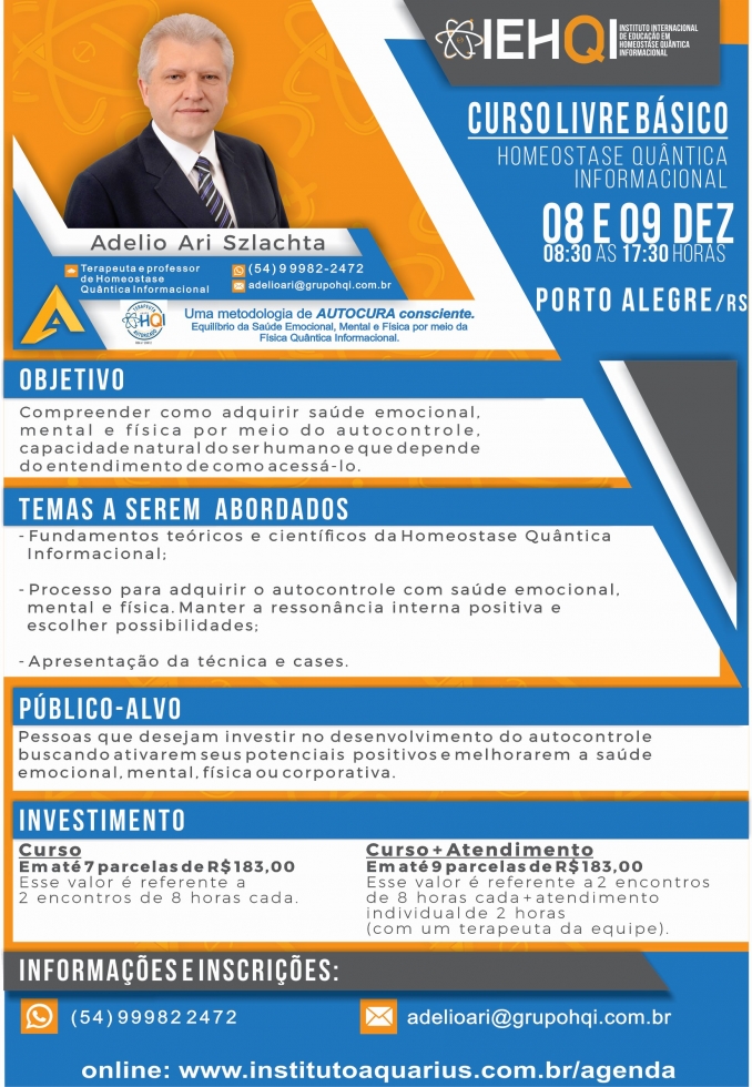 Porto Alegre/RS - Curso Livre Básico de Homeostase Quântica Informacional - Dias 08 e 09/12/18 - Prof. Adelio Ari Szlachta
