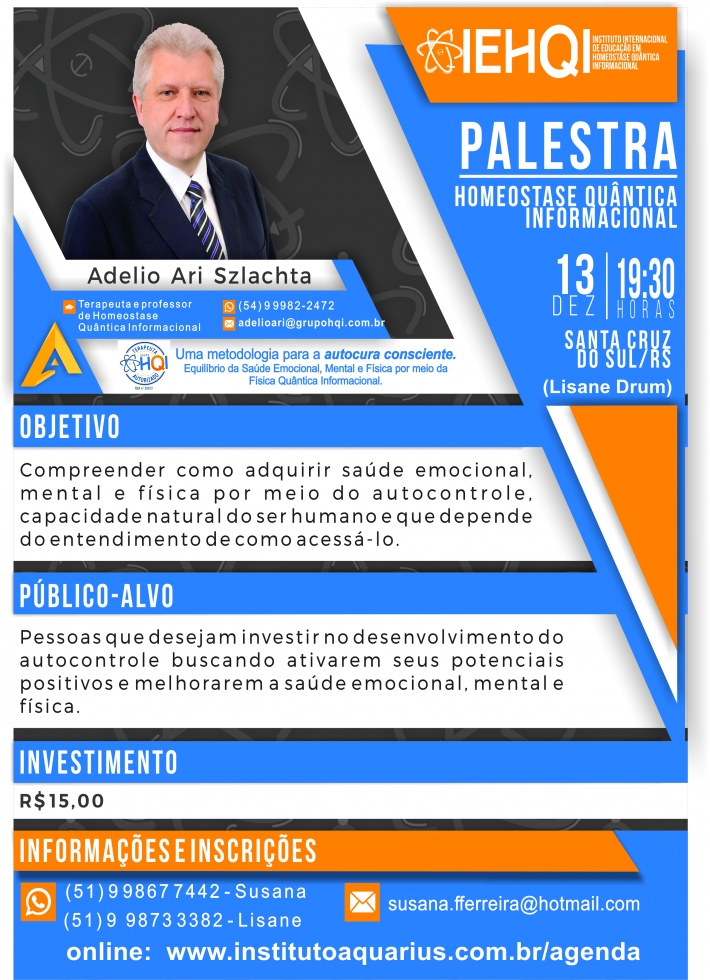 Santa Cruz do Sul/RS - Palestra de Homeostase Quântica Informacional - Dia 13/12/18 - Prof. Adelio Ari Szlachta