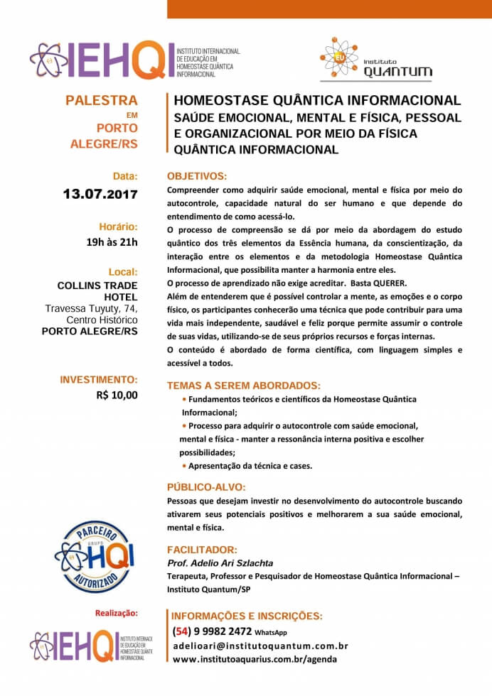 Porto Alegre/RS - Palestra de HQI - Homeostase Quântica Informacional - Dia 13/07/17 - Prof. Adelio Ari Szlachta