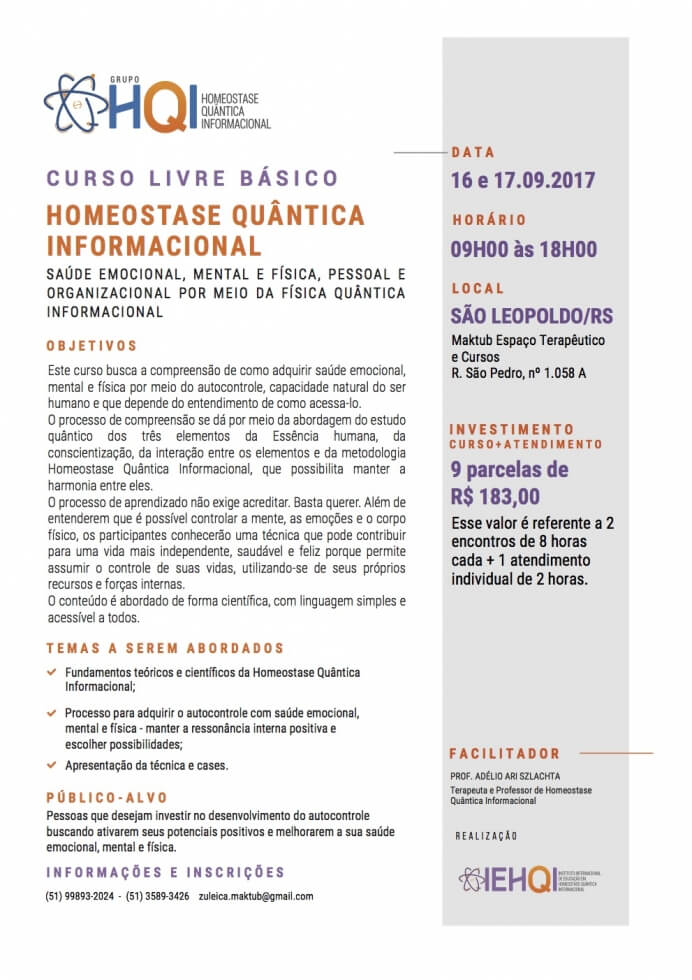 São Leopoldo/RS - Curso Livre Básico de Homeostase Quântica Informacional - Dias 16 e 17/09/17 - Prof. Adelio Ari Szlachta
