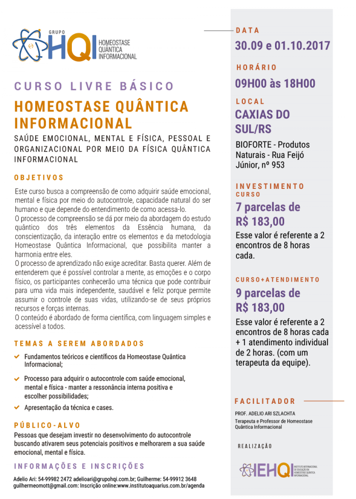 Caxias do Sul/RS - Curso Livre Básico de Homeostase Quântica Informacional - Dias 30/09 e 01/10/17 - Prof. Adelio Ari Szlachta
