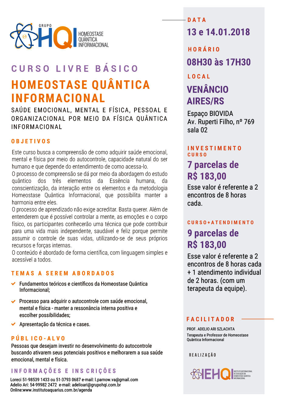 Venâncio Aires/RS - Curso Livre Básico de Homeostase Quântica Informacional - Dias 13 e 14/01/18 - Prof. Adelio Ari Szlachta