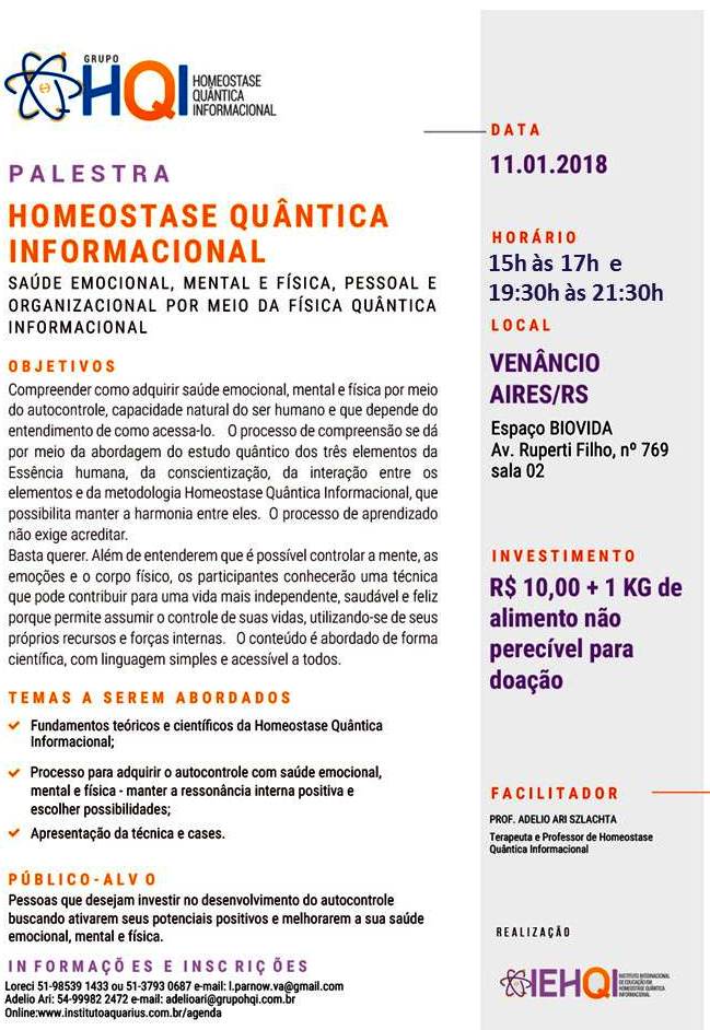 Venâncio Aires/RS - Palestras de Homeostase Quântica Informacional - Dia 11/01/18 - Prof. e Terapeuta Adelio Ari Szlachta