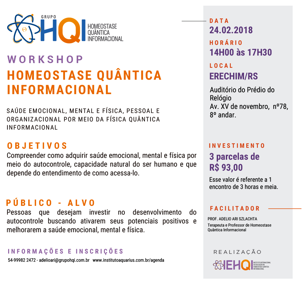 Erechim/RS - Workshop Equilíbrio Quântico Emocional por meio da HQI - Dia 24/02/18 - Prof. e Terapeuta Adelio Ari Szlachta