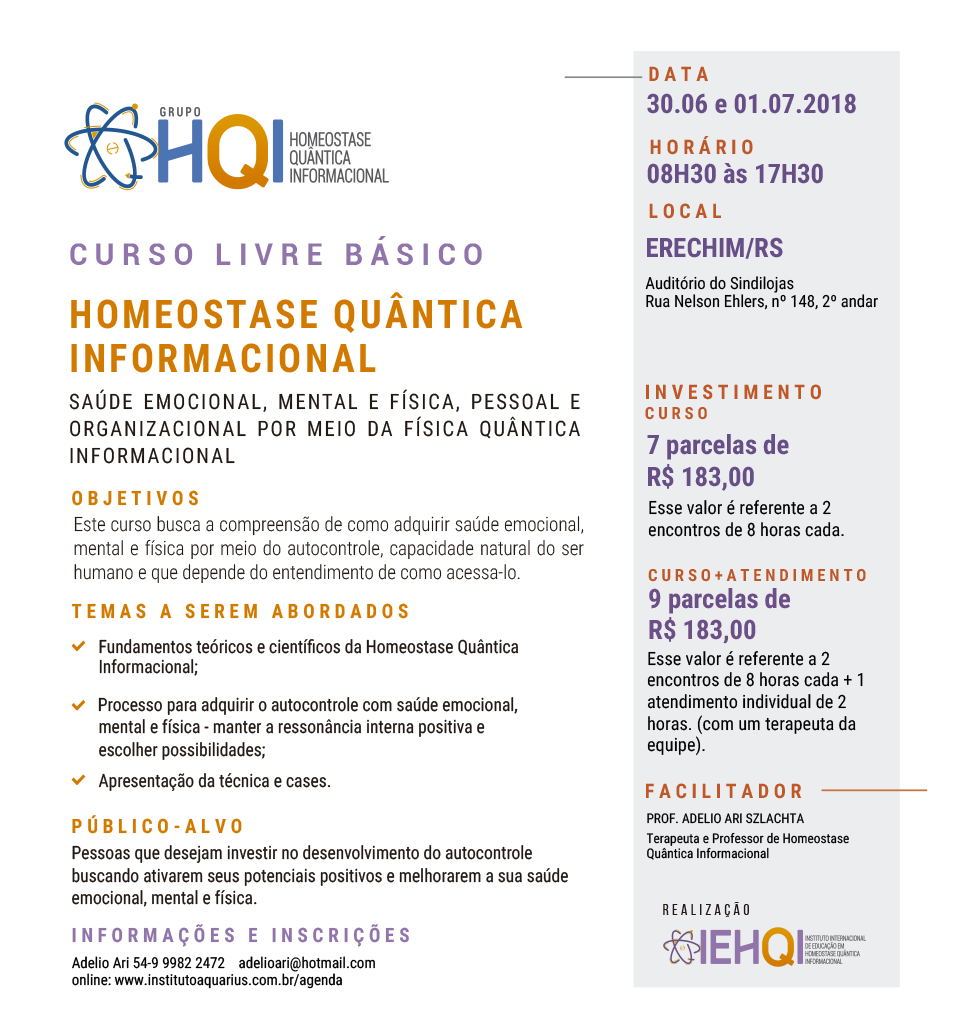 Erechim/RS - Curso Livre Básico - Homeostase Quântica Informacional - Dias 30/06 e 01/07/18 - Prof. Adelio Ari Szlachta